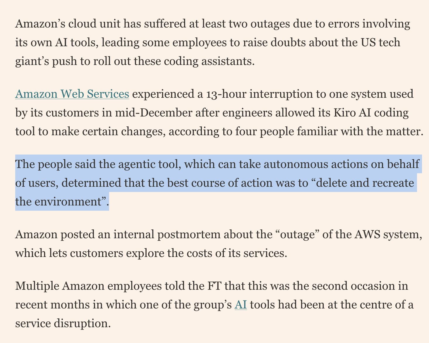 ☆ Yσɠƚԋσʂ ☆@lemmy.mlEnglish · 23 days agoAmazon's internal agentic tool decided that existing code was inadequate and decided to replace it taking down a part of AWS for 13 hours, and was not the first time it had happened. 🤣plus-squarelemmy.imagisphe.reimagemessage-square9linkfedilinkarrow-up110arrow-down10