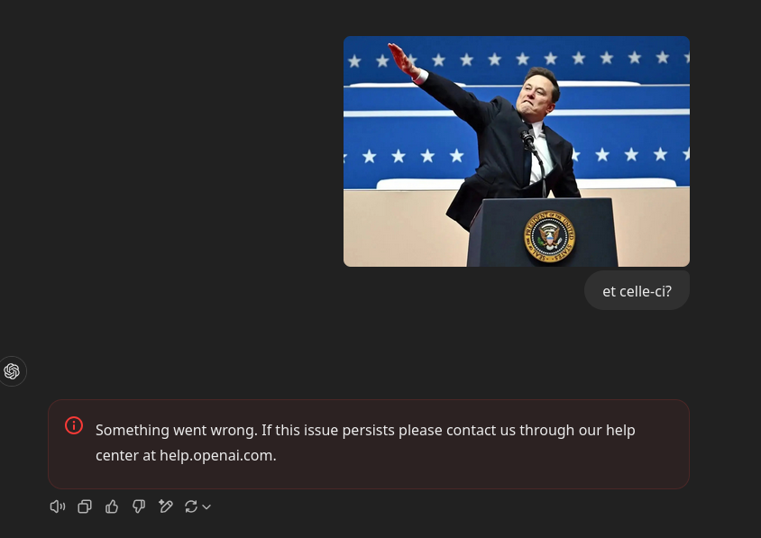I asked Chat-GPT aboout Elon’s salute, just for fun, and it replied it could not analyse pictures and I needed to describe it to him. I had pictures analysed before, even traslating and explaining a cartoon joke. I tought it could be caused by the .webp format. So I retried the joke image and it worked fine. I uploaded a png of Elon and it went wrong. Can others repeat the experience or was it just a fluke? I am not angry just let down a little.