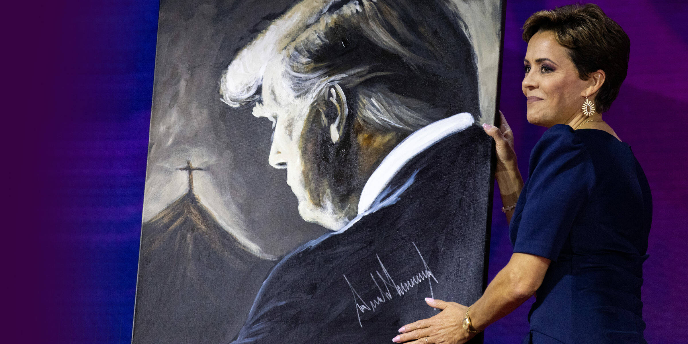 Big fan, bigly, even … Kari Lake shows off a painting of Donald Trump at the Conservative Political Action Conference in 2023