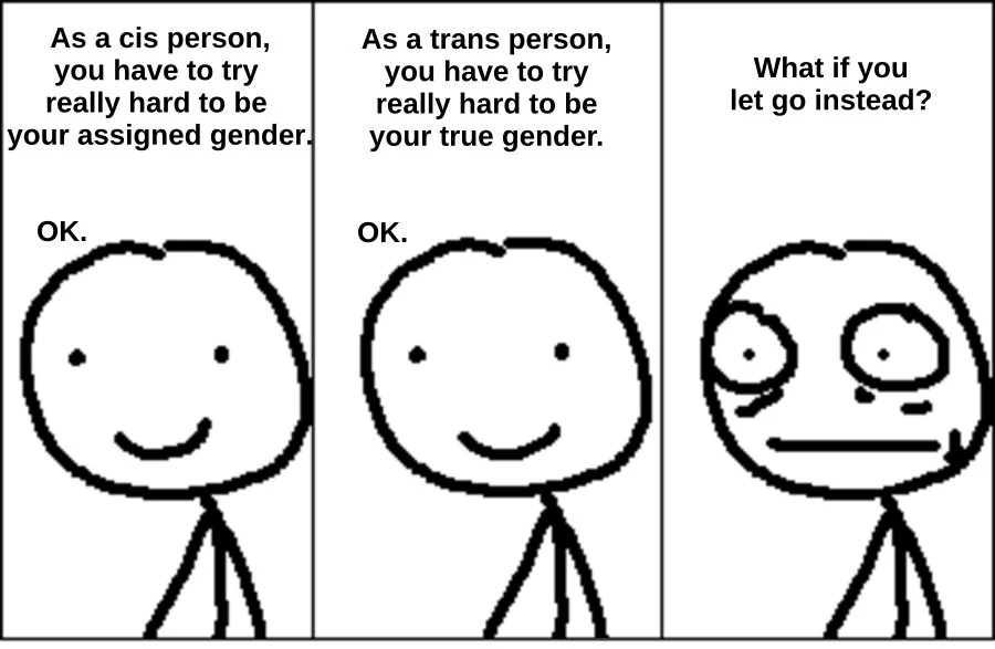 Description: A three panel comic. In the first picture a caption says “As a cis person, you have to try really hard to be your assigned gender.” A smiling stick figure responds with “OK.” In the second picture a caption says “As a trans person, you have to try really hard to be your true gender.” The same smiling stick figure responds with “OK.” once more. In the last picture the caption says “What if you let go instead?” The stick figure stares with eyes wide open.