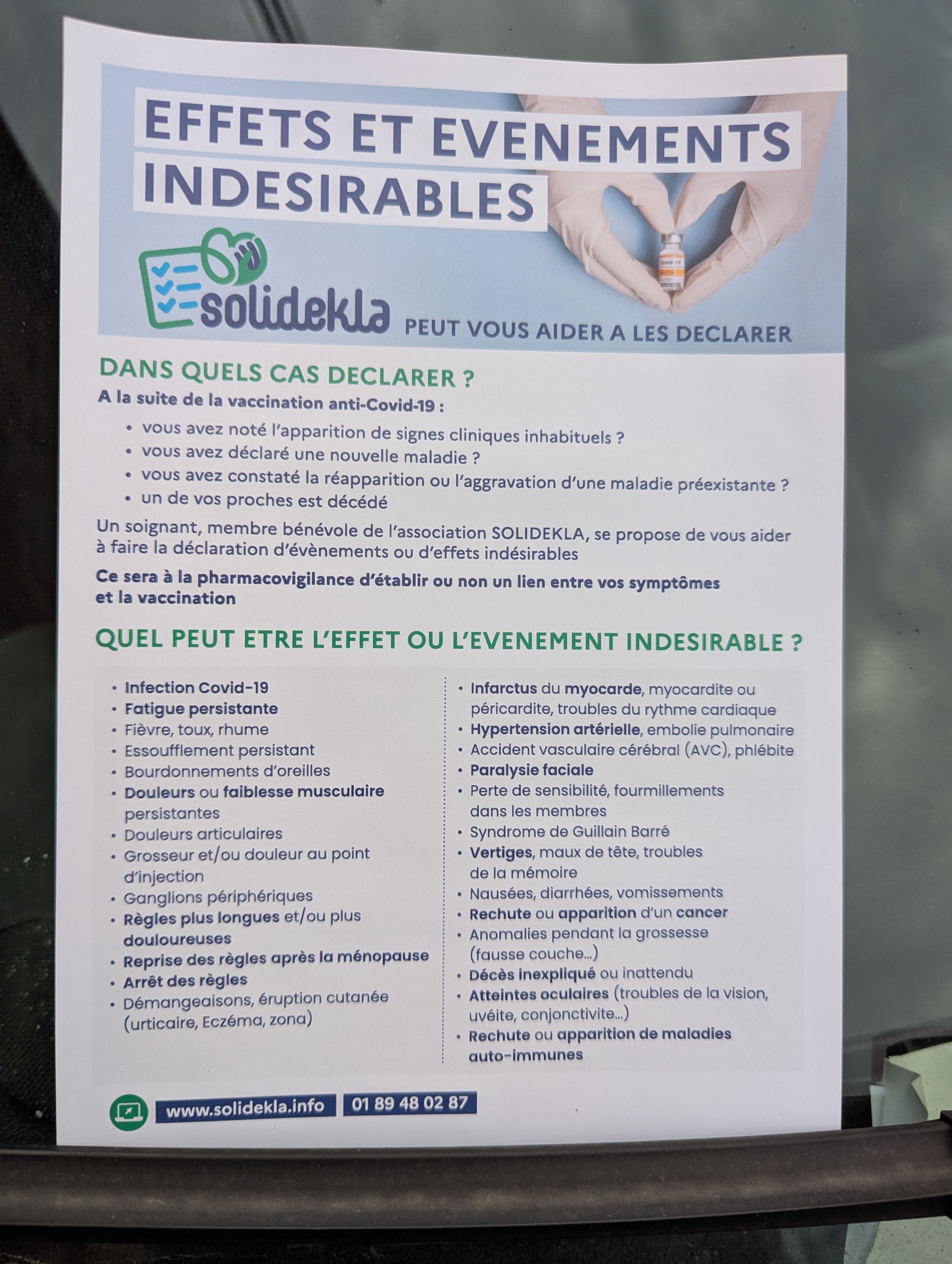 Lors de la braderie dans ma ville dans le Nord, voilà le tract qui est retrouvé sur les voitures. Ils cherchent tous les symptômes liés au vaccin anti-covid.Tout pour alimenter leurs psychoses…