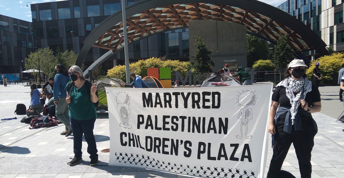 On Tuesday, a group of current and former Microsoft employees, as well as community members, took over a plaza at Microsoft’s headquarters in Redmond, Washington, as part of a No Azure for Apartheid protest.