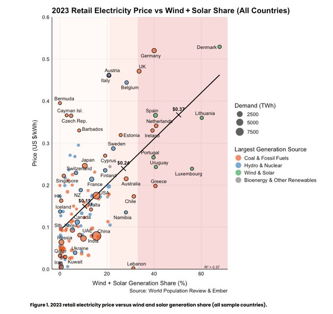 •⁠ ⁠Countries that exceed 33% wind and solar generation, have electricity prices of around US $0.37/kWh on average.