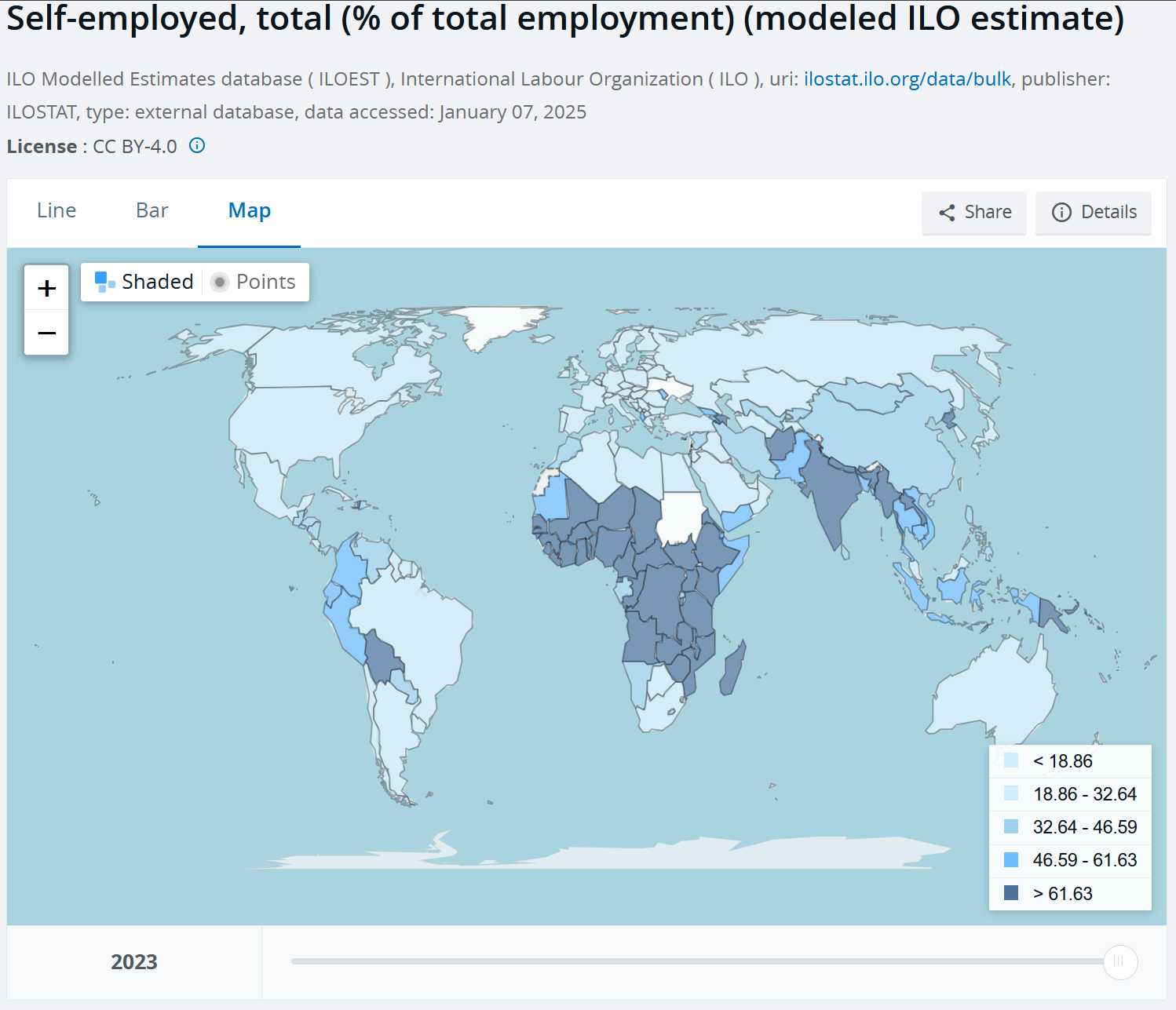 In developed countries exist more laws against pretended self-employment and more small businesses incorporate, thus lowering those numbers.