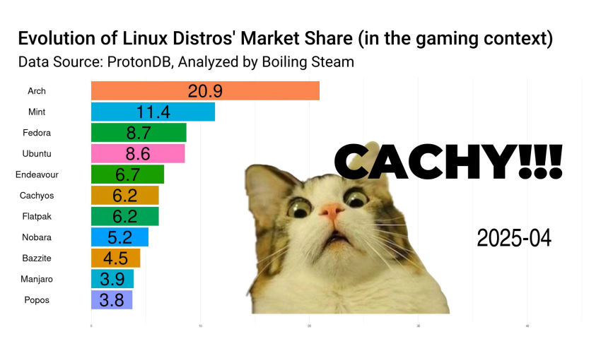 This is PC operating systems which by ProtonDB definition excludes Steam Deck. See https://boilingsteam.com/cachy-os-keeps-spreading-and-takes-second-place-among-linux-distros/index.html for more information.