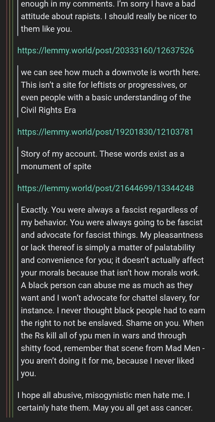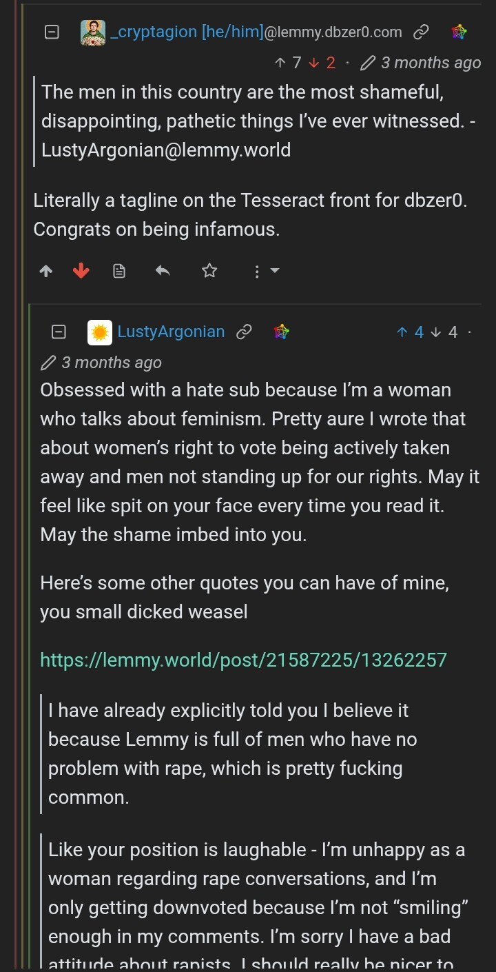 If you look at the second link, a user told me they proudly laugh at me and have pics of my comments as their banner - because I am angry that Project 2025 is killing women, enslaving women, and taking away our rights, and men seemingly do not give a fuck at all. In fact they complain about lack of sex and intimacy and gaslight women telling us to calm down, or to fuck rightwing men to calm them down and get them on our sides (you have holes, use yours). I will never join that instance if that is considered okay behavior.