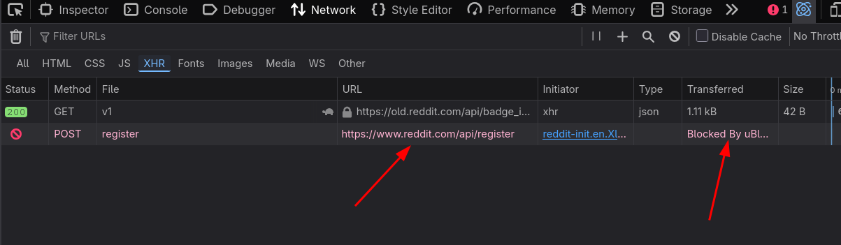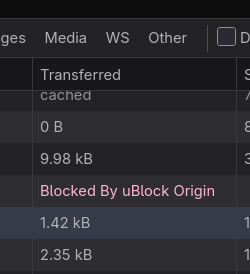 I tested without uBO installed of course, but anyway, requests blocked by uBO are shown in red with “Blocked by uBO” in the “Transferred” column.