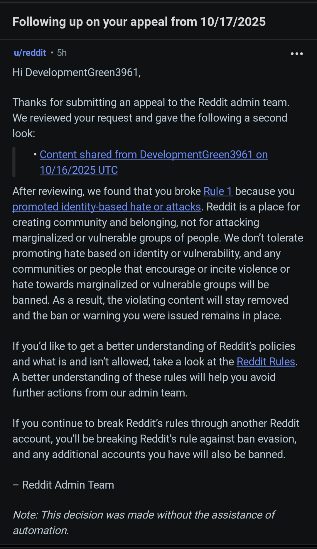 They manually reviewed it and kept the ban!