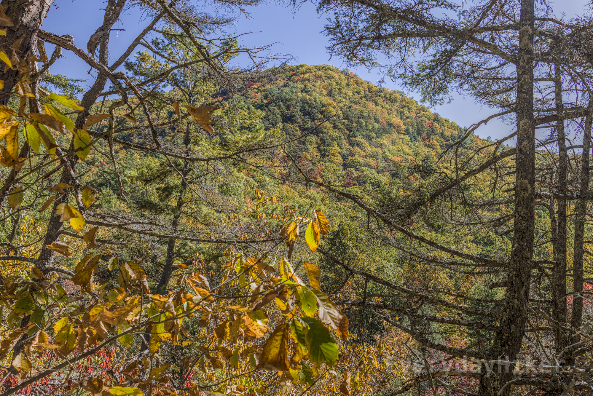 Looking up at a hillside with various early fall colors showing in the trees from a small vantage point along the trail.