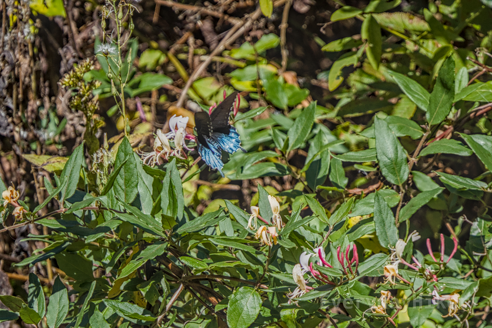 What I believe to be a Pipevine Swallowtail butterfly foraging among the honeysuckles.