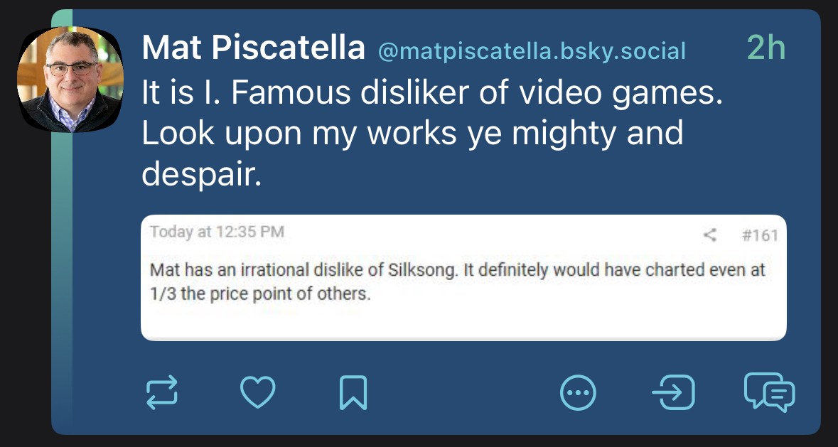I’m not sure how that’s relevant. I even considered the possibility of them ordering the list based on revenue instead of units sold but even then it doesn’t make sense that there’s no Silksong in the top 20. One of the most anticipated title of the year in its release month makes less revenue than RDR2? And it doesn’t explain any other anomalies, like Helldivers 2, which has been out for over a year, selling better than Snake Eater, which is considered one the best MGS titles?