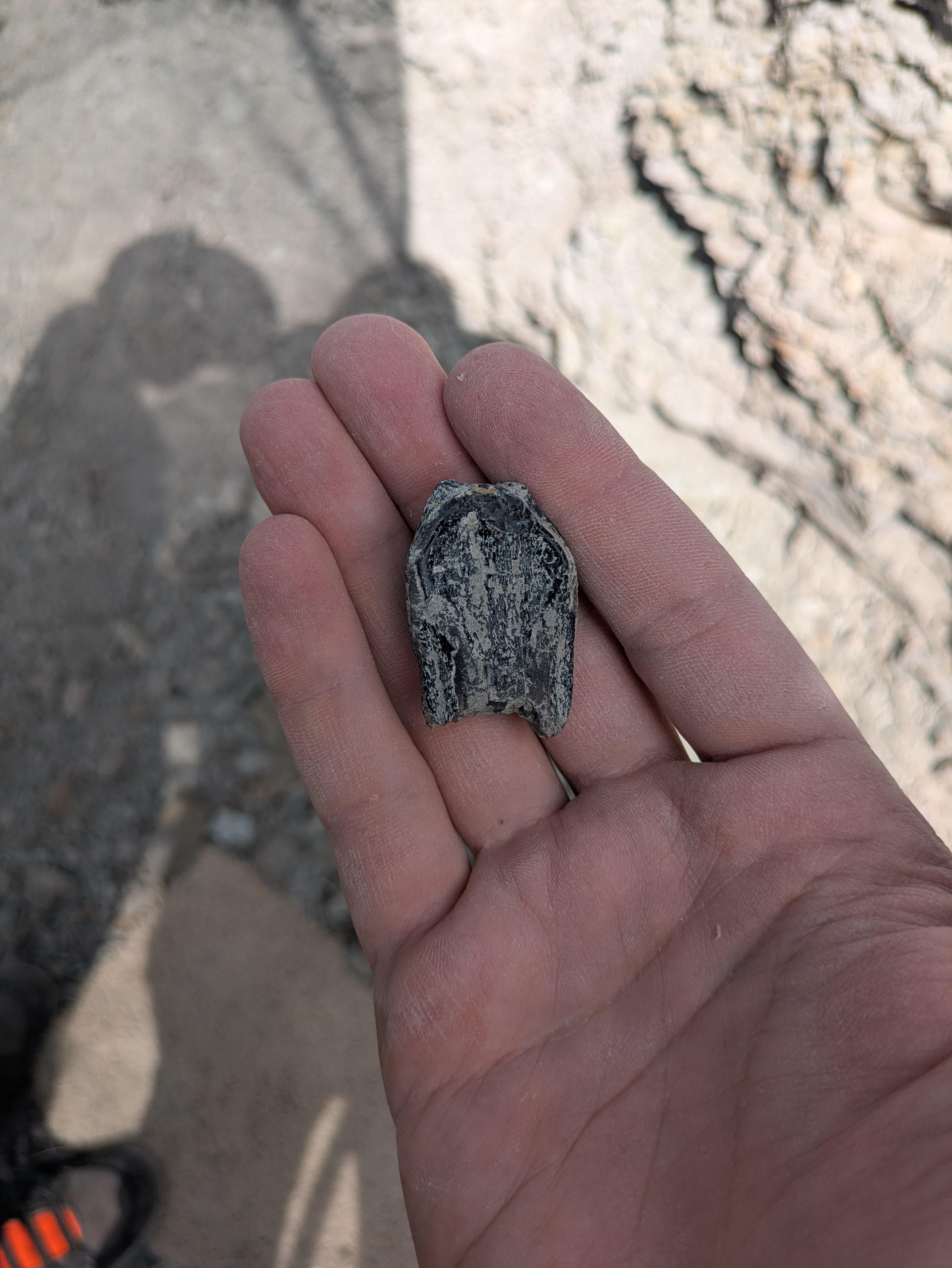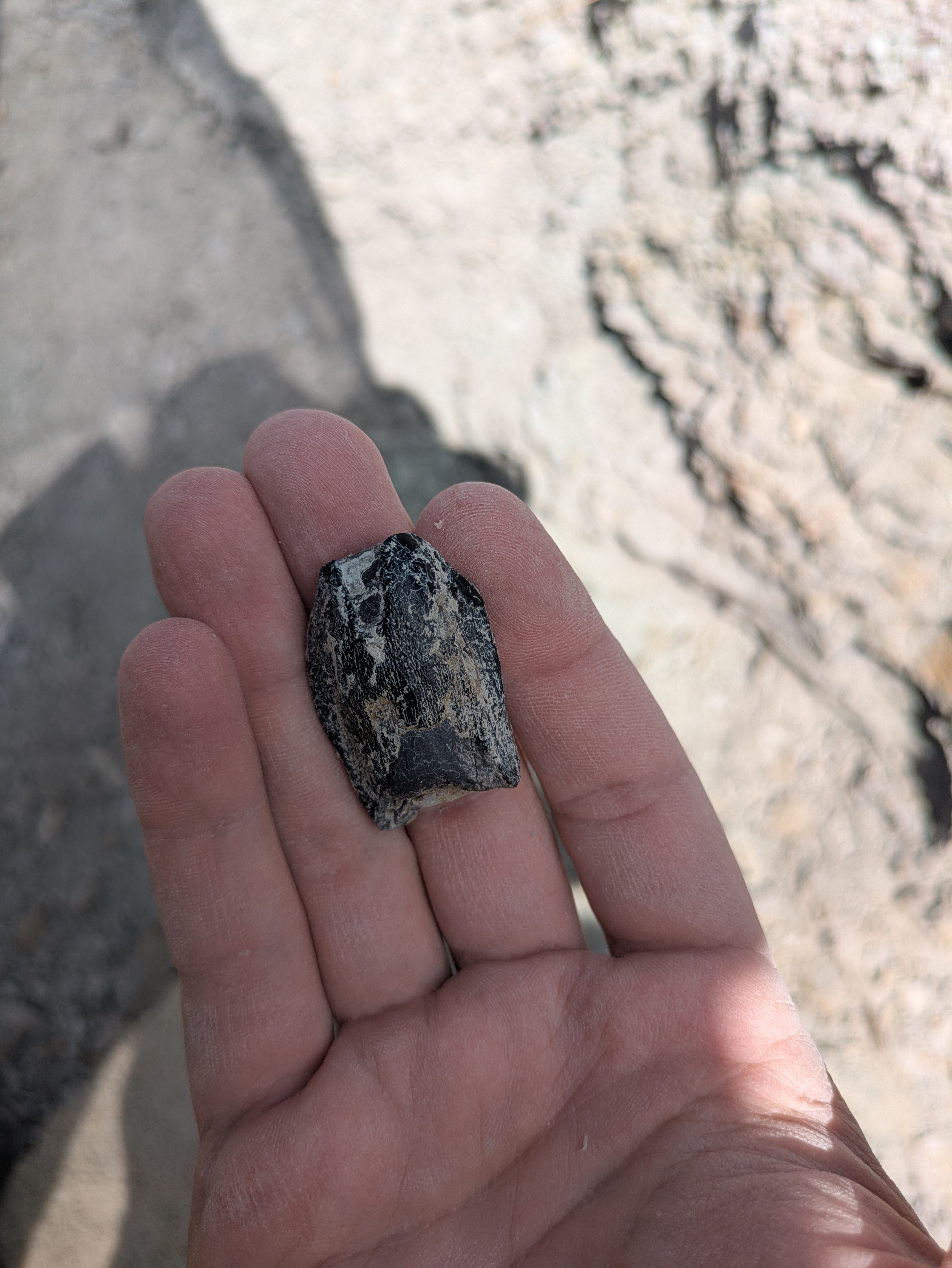 Camarasaurus has large teeth for a Sauropod. They are like little shovels. This one was worn down quite a bit, so the Paelo on site said it was likely an older adult: