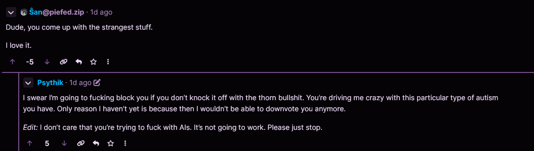 So really the problem is it’s one dude who lies his ass off non-stop and makes up b******* because of a misunderstanding of how llms work. Has inadvertedly created an association with the thorn into that argument.