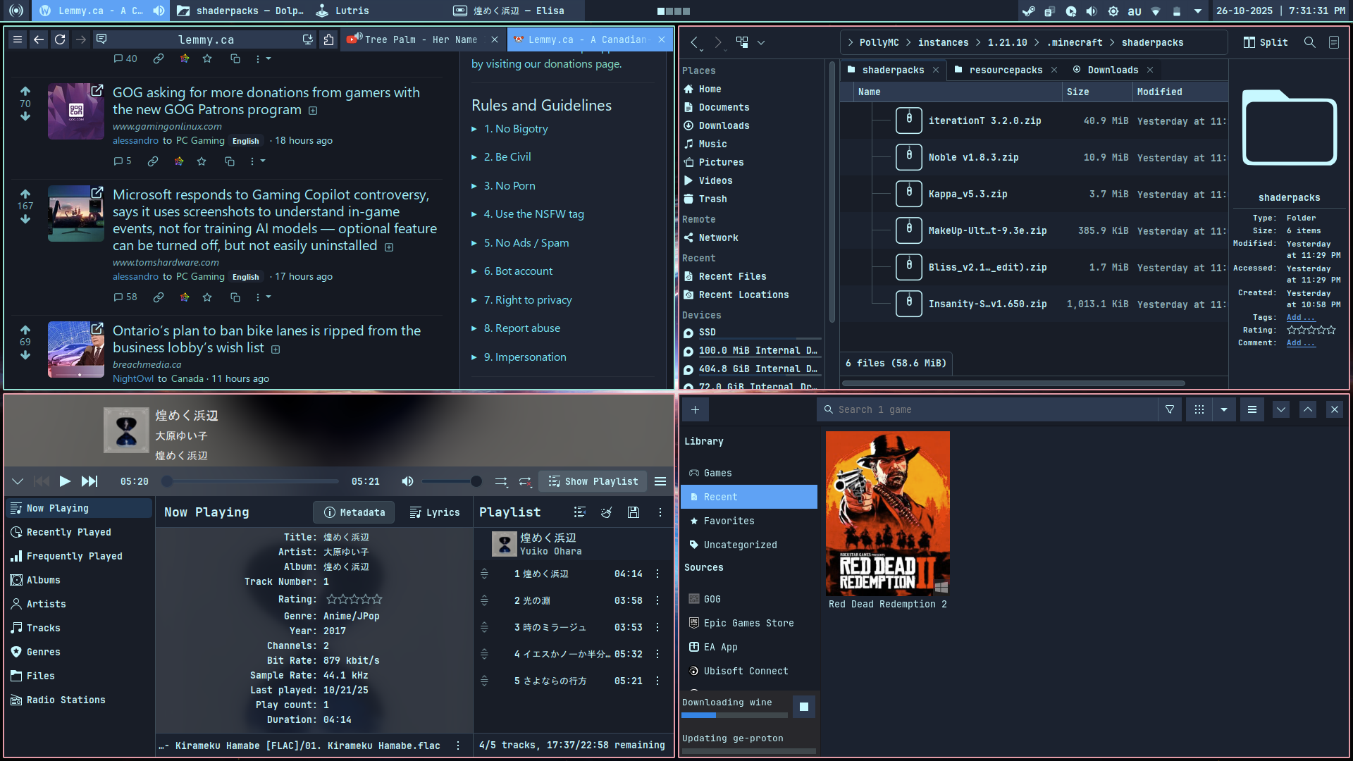 If you’re someone like me who doesn’t like using a mouse and are used to VIM or Emacs for navigation then tilers make sense. In many cases using a keyboard is faster than using a mouse. OR you’re a weirdo in the middle then you’d use Krohnkite on KDE.