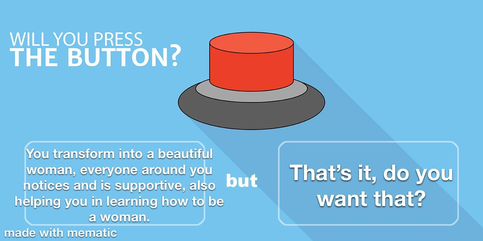 I think I might have the dumbest gender identity, because I’d smash the hell out of that button but then immediately come out as a trans man.