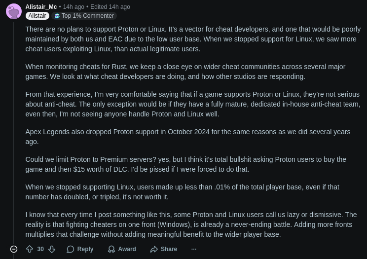 mr_MADAFAKA@lemmy.ml to Linux Gaming@lemmy.worldEnglish · 7 days agoThe COO at Facepunch Studios (developers of Rust) commented on Rust Linux support, and it might never be supported again in the foreseeable futurelemmy.imagisphe.reimagemessage-square59linkfedilinkarrow-up1148arrow-down15file-text