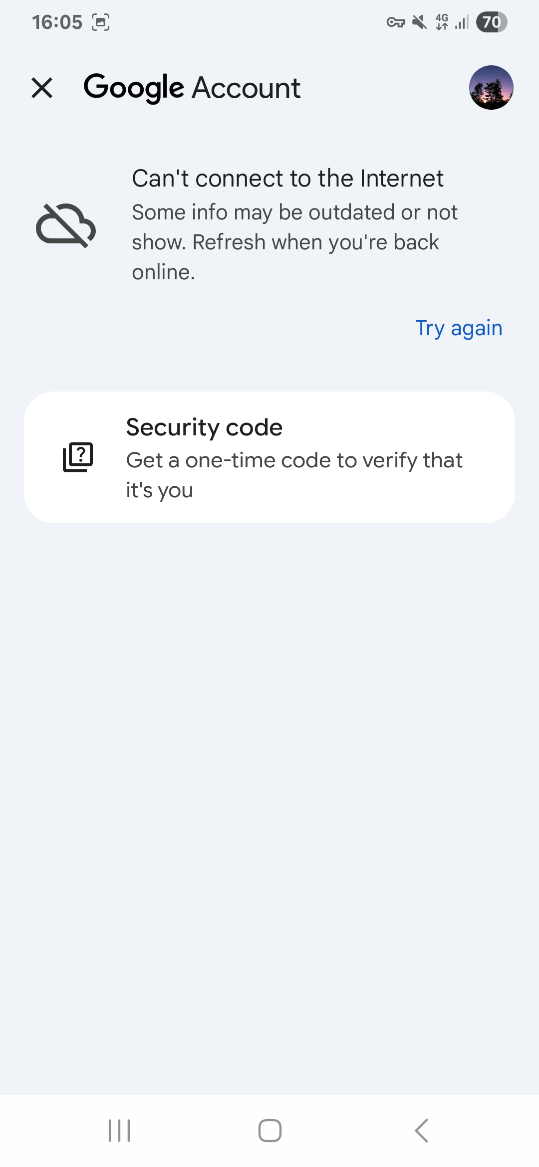 When I tap on my profile picture and then select “Google Account” it tells me I’m not connected to the internet (see screenshot). But I am, using my browser for example works just fine.