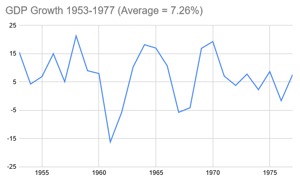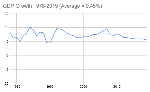 In the People’s Republic of China, under Mao and later the Gang of Four, growth was overall positive but was unstable. The centrally planned economy had brought great benefits in many areas, but because the productive forces themselves were underdeveloped, economic growth wasn’t steady. There began to be discussion and division in the party, until Deng Xiapoing’s faction pushing for Reform and Opening Up won out, and growth was stabilized: