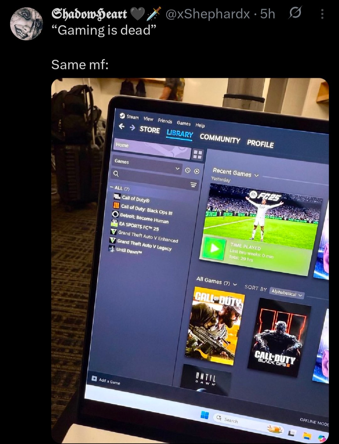 arrow-up1591arrow-down1image"gaming is dead"lemmy.imagisphe.reThe Picard Maneuver@piefed.world to Gaming@lemmy.worldEnglish · 3 days agomessage-square111linkfedilink