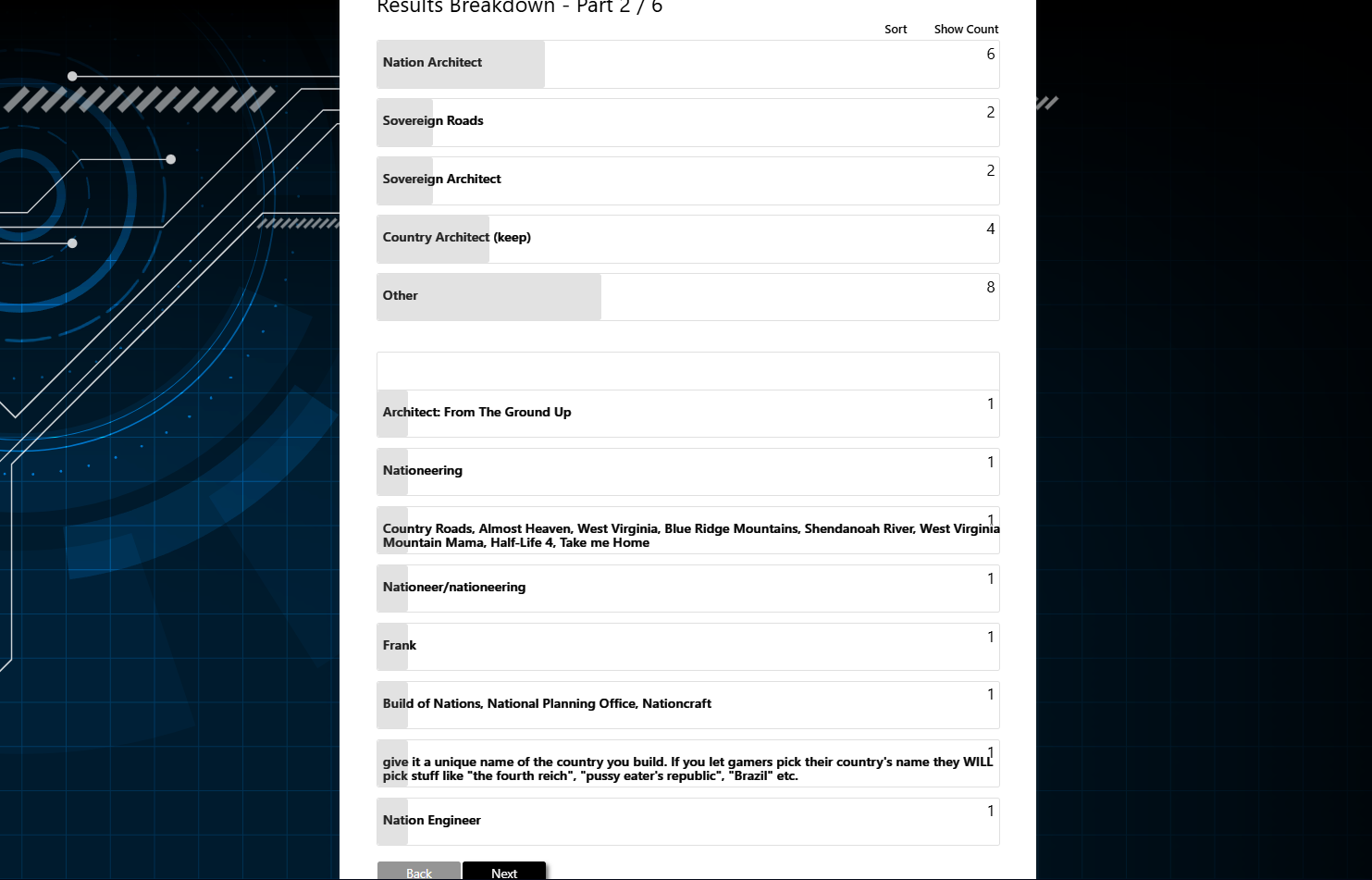 I like Country Architect too! It could lead to a country-esk builder who builds small towns and leads them to building nations based on principles the player learns from starting simple and escalates on the premise that different cities and states will act according to geographic landscape and resources. I wish OP the best in naming his game and designing the systems of play that bring education and principles into the forefront of a player’s motivations