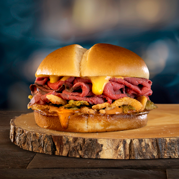 Kangaroo sizzle steaks, cheese, and bacon on dark rye bread.