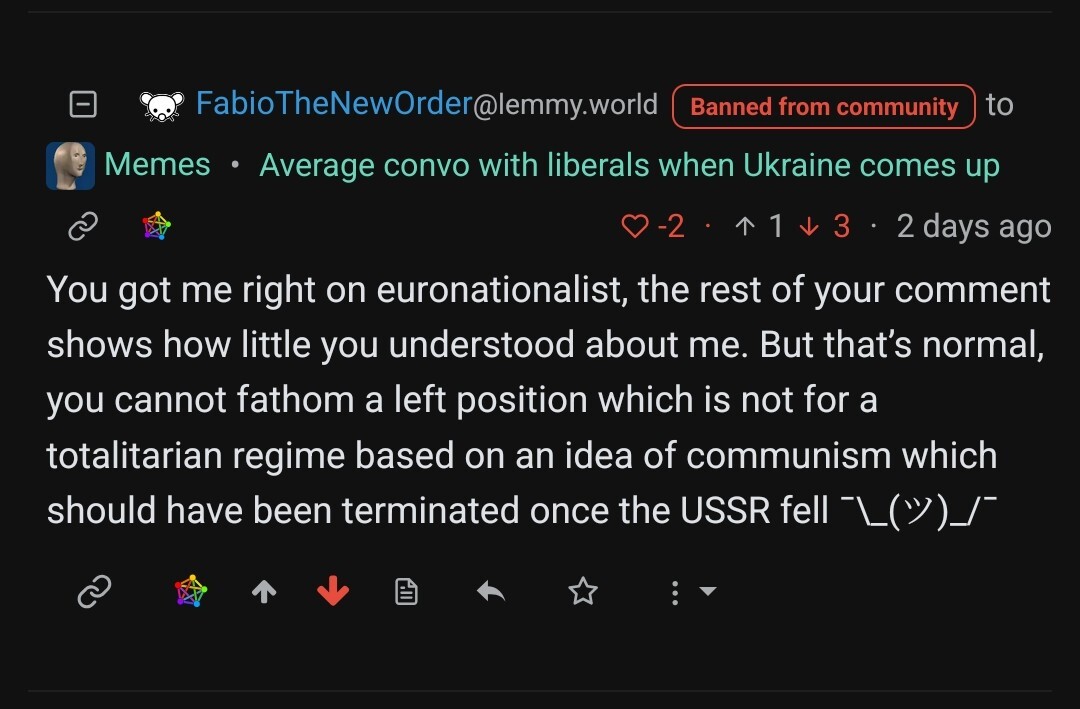 You’re defending an anti-communist, Euronationalist, homphobic racist. In other words, the archetypical fascist, who is in this case trying their best to minimize the crimes against humanity of a far-right neo-Nazi regime that is ethnically cleansing their territory of Russians.