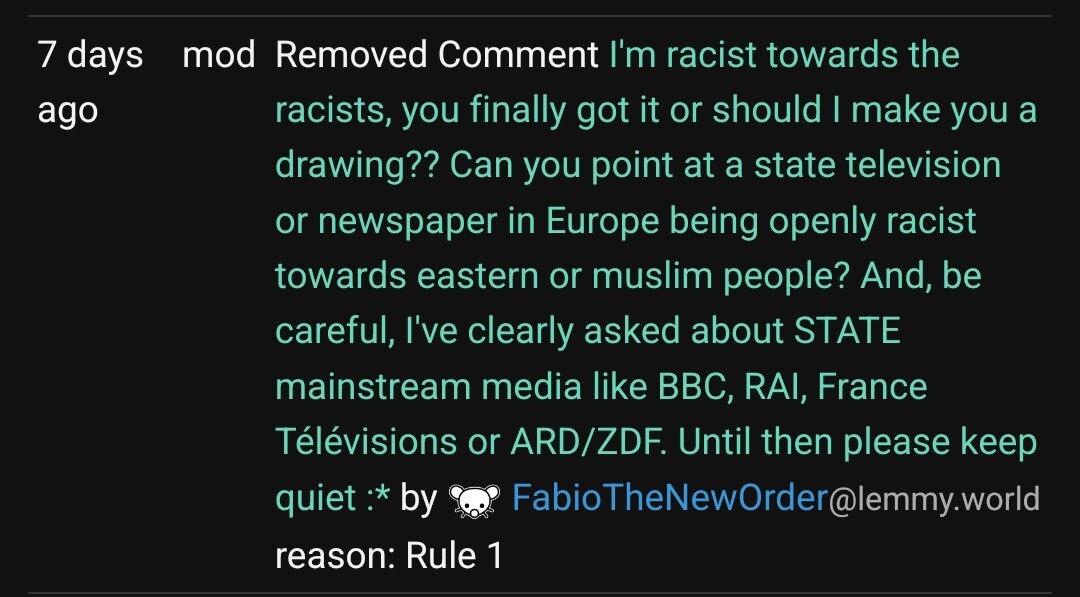 Cowbee replied to you and included links to some propaganda websites, while your perfectly reasonable comment was removed because, looks up rule 1, you apparently weren’t “civil and nice”.