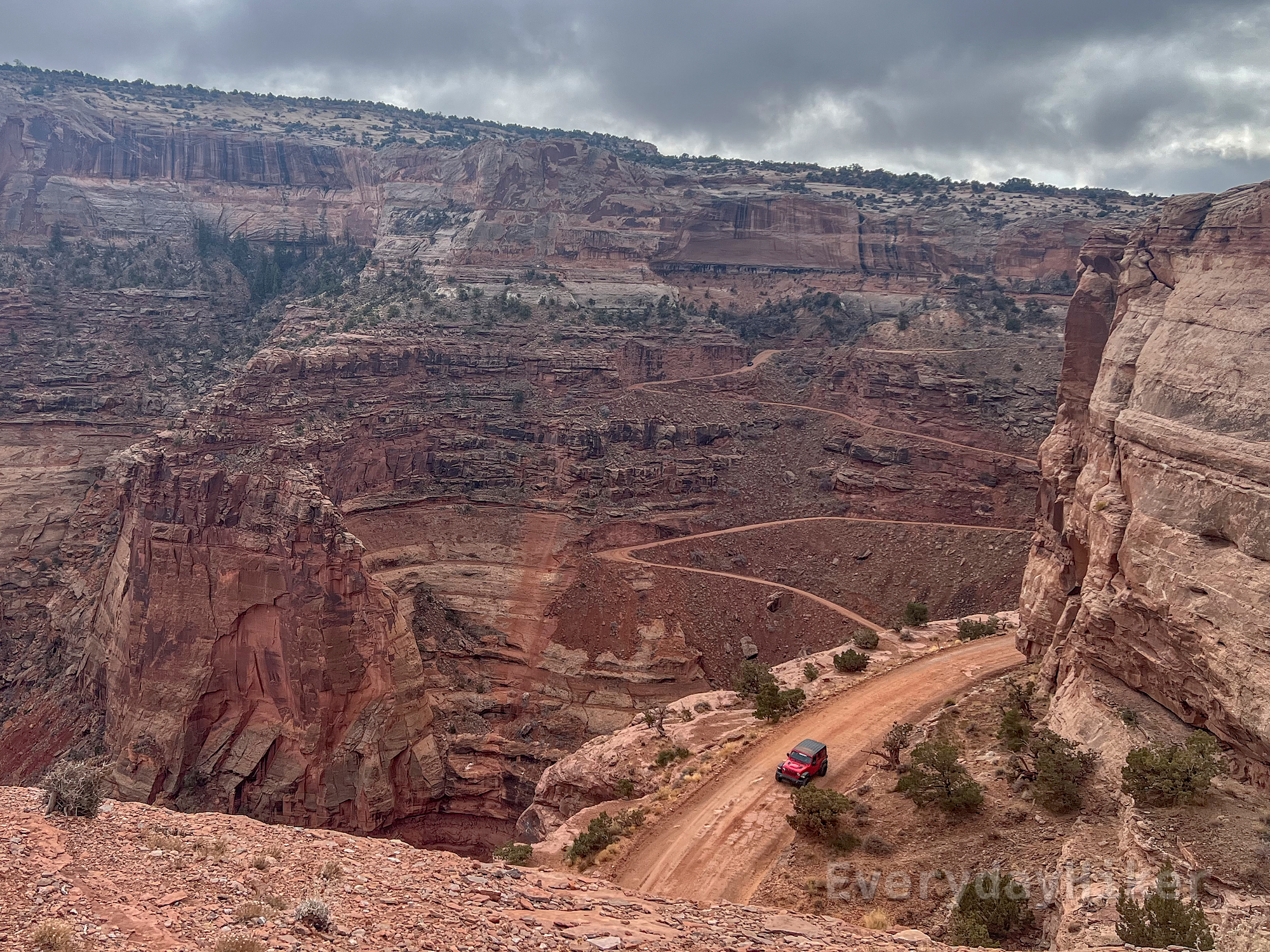 A red jeep drives along the Shafer Trail below the viewing area. A large sandstone cliff wall may be seen behind it with a portion of the road descending out of view.