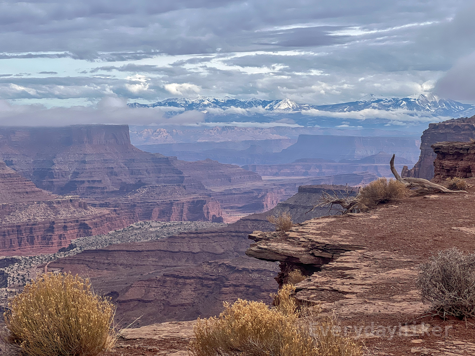 A view of Shafer Canyon from the flatlands above it on the right of frame, where a small lip may be seen extending over the edge. Clouds mix in with the La Sal Mountains in the distance.