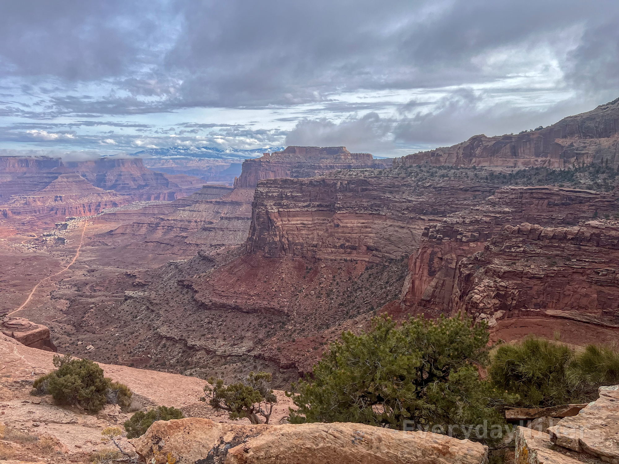 Looking across to one side of the canyon walls, where sheer cliffs may be seen with a variety of terraces locate among them. The Shafer Trail road cuts along the left of frame and the La Sal Mountains may be seen in the distance, mingling with the clouds.