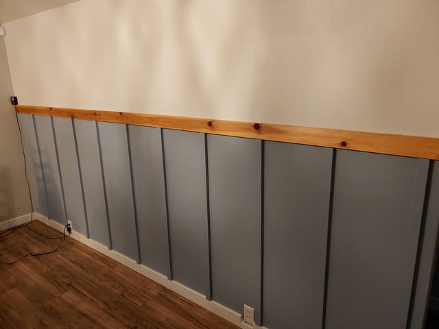 Short term solution was to bury it behind bookshelves, but it’s still there… LURKING. It irks me just knowing it’s still there, that half-assed wainscoting made of plywood strips and blue paint.