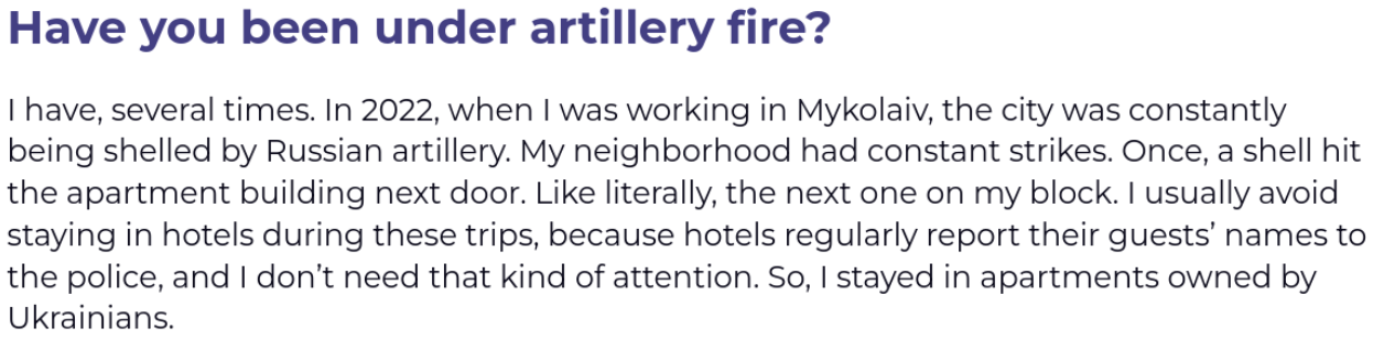 After the invasion of Ukraine, the newspaper was shut down. She left Russia and moved to Eastern Ukraine. She started systematically documenting war crimes committed against Ukrainian civilians