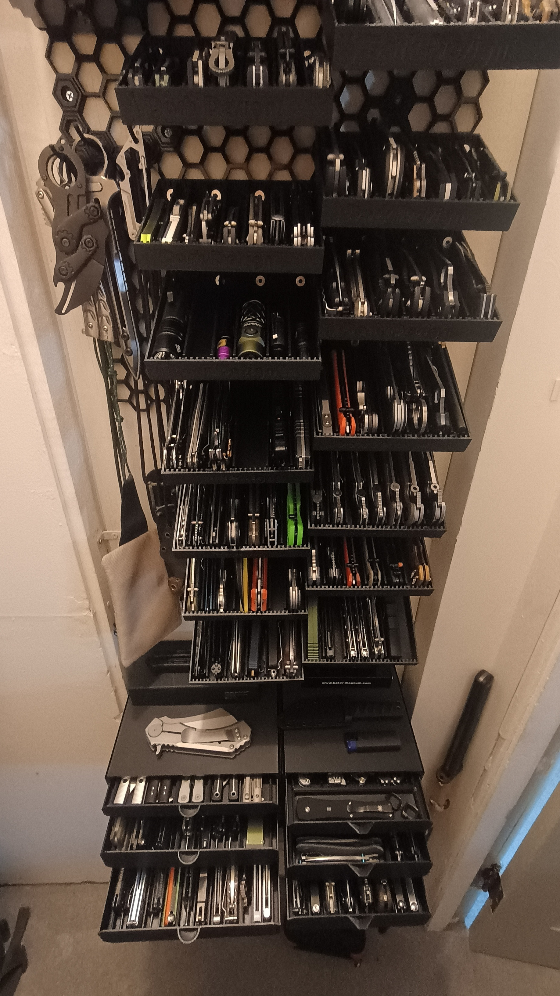 The backplane is the rather popular 3D printable Honeycomb Wall system. The angled divider trays are my own design which is compatible with the same.