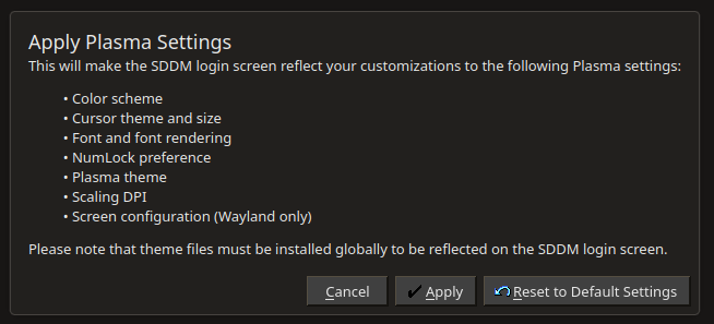 there’s a button to apply Plasma settings to SDDM for this purpose, it prompts for admin password when you do it, which makes sense