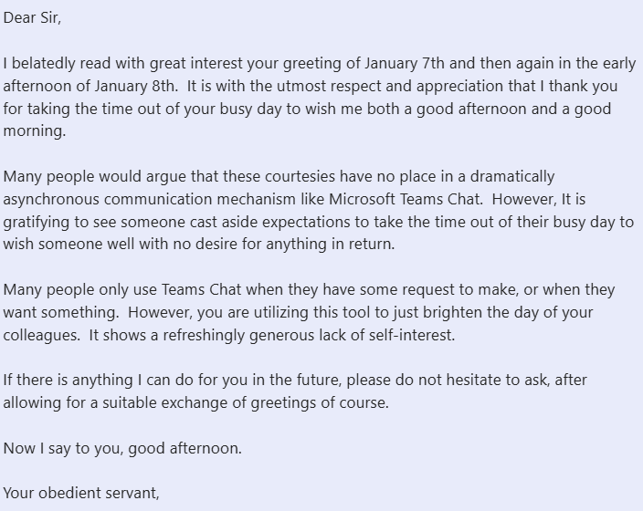 In Teams, use your pedantic BS pleasantry if you absolutely must.