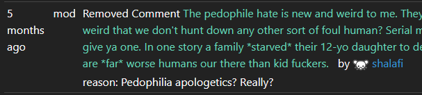 I mean, Jesus, just look at their modlog… banned for pedo apologia, actual antisemitism, civility, etc etc etc. Pages of mod actions…