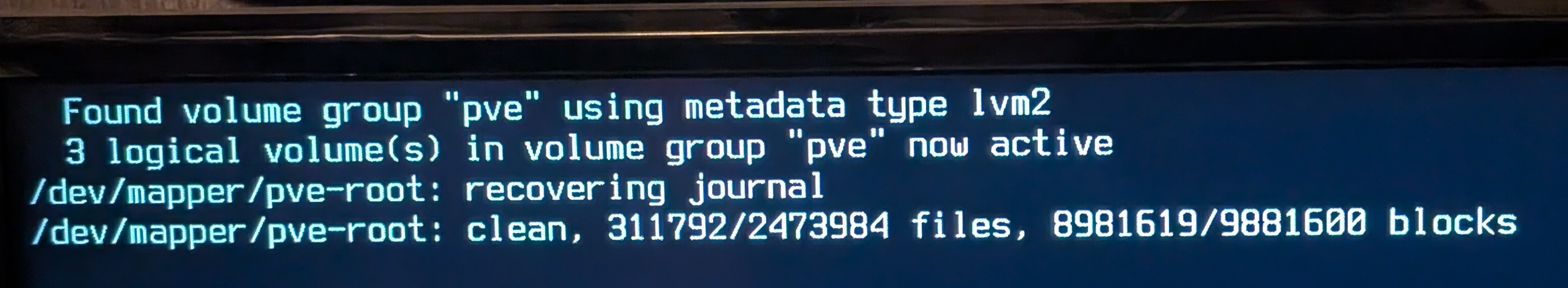 Recently, when I reboot my Proxmox hardware, I’m greeted with this message after the bootloader splash screen. It won’t progress any further, even after letting it sit overnight.