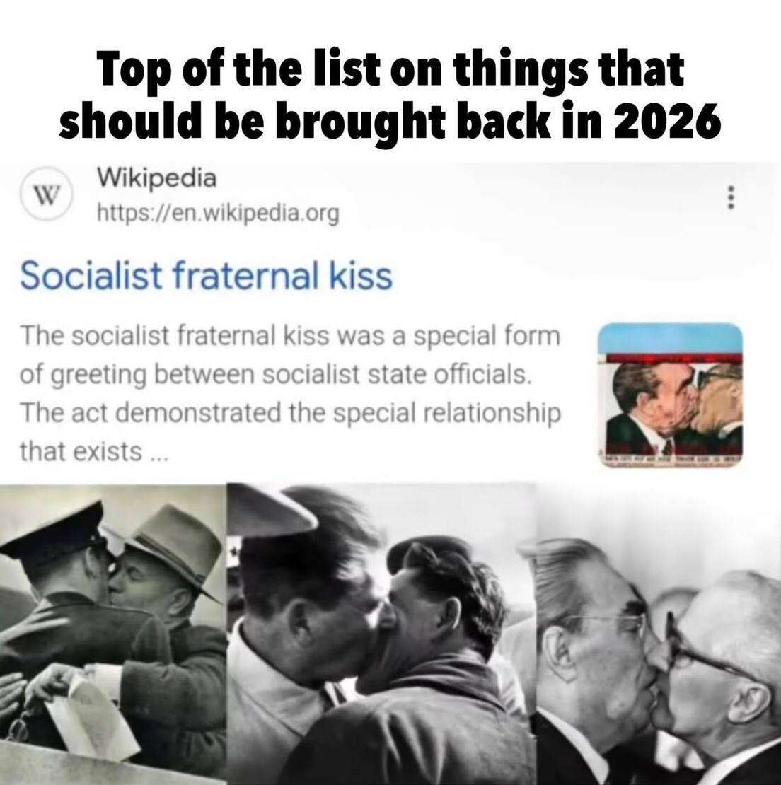 minus-squareMaeve@kbin.earthlinkfedilinkarrow-up4·2 months agohttp://2.bp.blogspot.com/-PAzPri0MCw8/UzDpRQHnAZI/AAAAAAAAI2I/BgAMUiWWPd4/s1600/The+Socialist+Fraternal+Kiss+between+Leonid+Brezhnev+and+Erich+Honecker+1979.jpg https://www.rferl.org/a/the-soviet-kiss-gone-but-not-missed/29161360.html