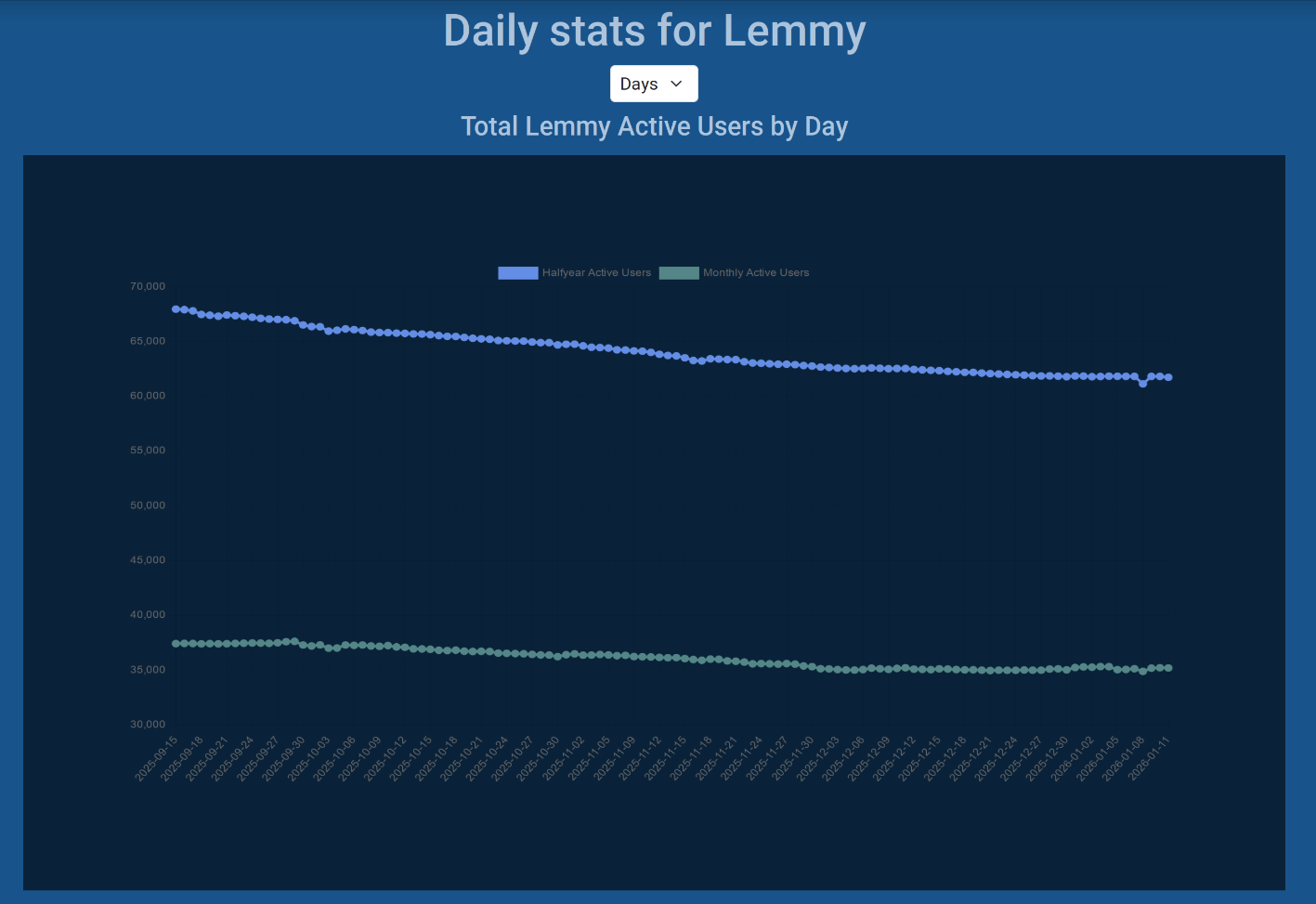 Using the daily rather than monthly view on https://lemmy.fediverse.observer/dailystats&days=120 shows a much stable line (especially if you take into account Piefed’s growth: https://piefed.fediverse.observer/dailystats&days=120 )