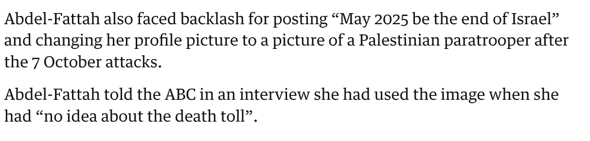 Abdel-Fattah faced backlash for posting “May 2025 be the end of Israel” and changing her profile picture to a picture of a Palestinian paratrooper after the 7 October attacks.