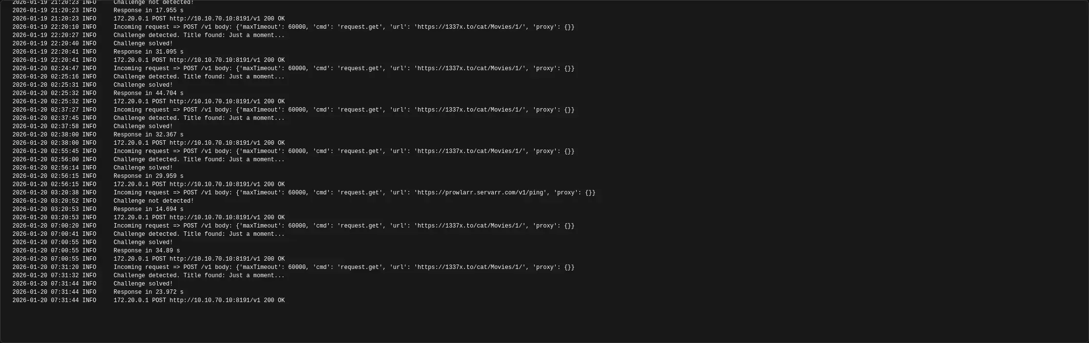 I’ve also read in a few locations that flaresolver supposedly doesn’t work anymore, but it seems to be chugging along just fine in my setup. If I try to use the 1337x tracker without flaresolver, retrievals will fail every time. Including a screenshot here of the most recent flaresolver logs. I do run flaresolver through my VPN connection - not sure if that would have anything to do with it.