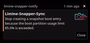 Stop creating a snapshot boot entry because the boot partition usage limit 85.0% is exceeded.