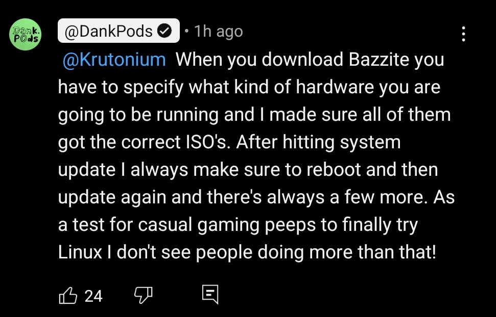 This misses the point. Dankpods intentionally tested this way, and used Bazzite, to try and show what this would be like for the average gamer schmuck without a ton of technical skill interested in switching to Linux. Out of box experience matters in this situation, even though it’s not quite fair to compare that between free opens source distros and an OS created by a megacorp. To the average end user, it won’t matter. They just want it to work.