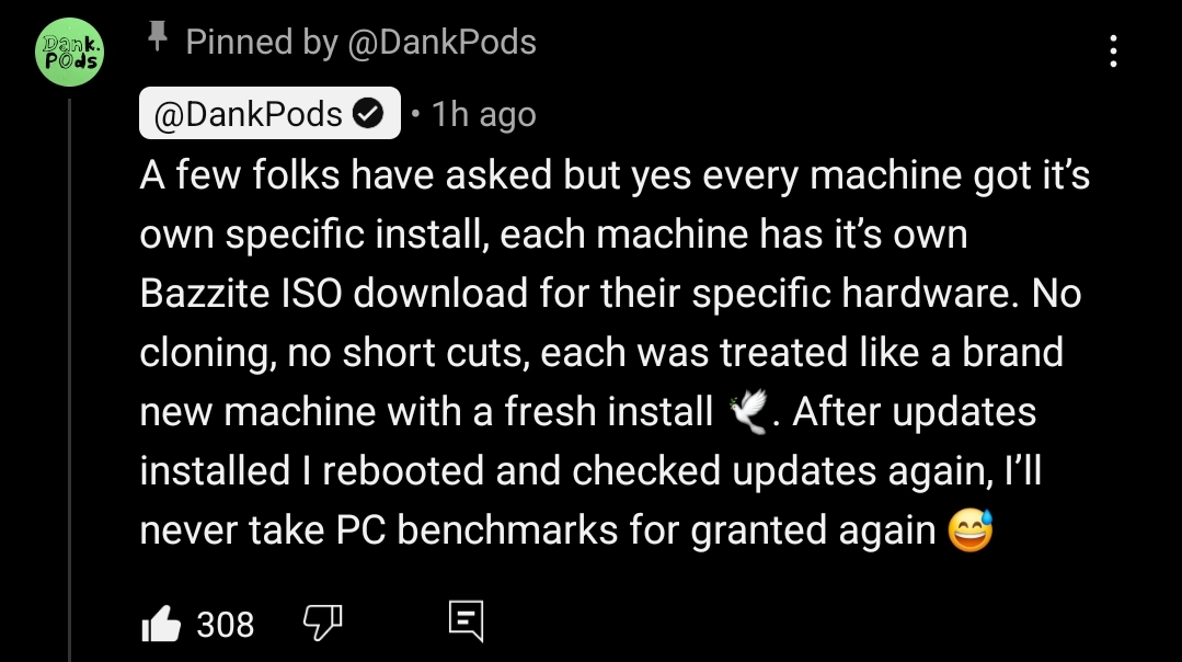 Each bazzite install was fresh, no copying installs or swapping around a drive with it pre-installed. After install, it was updated using system update and rebooted, repeated until no updates remained.