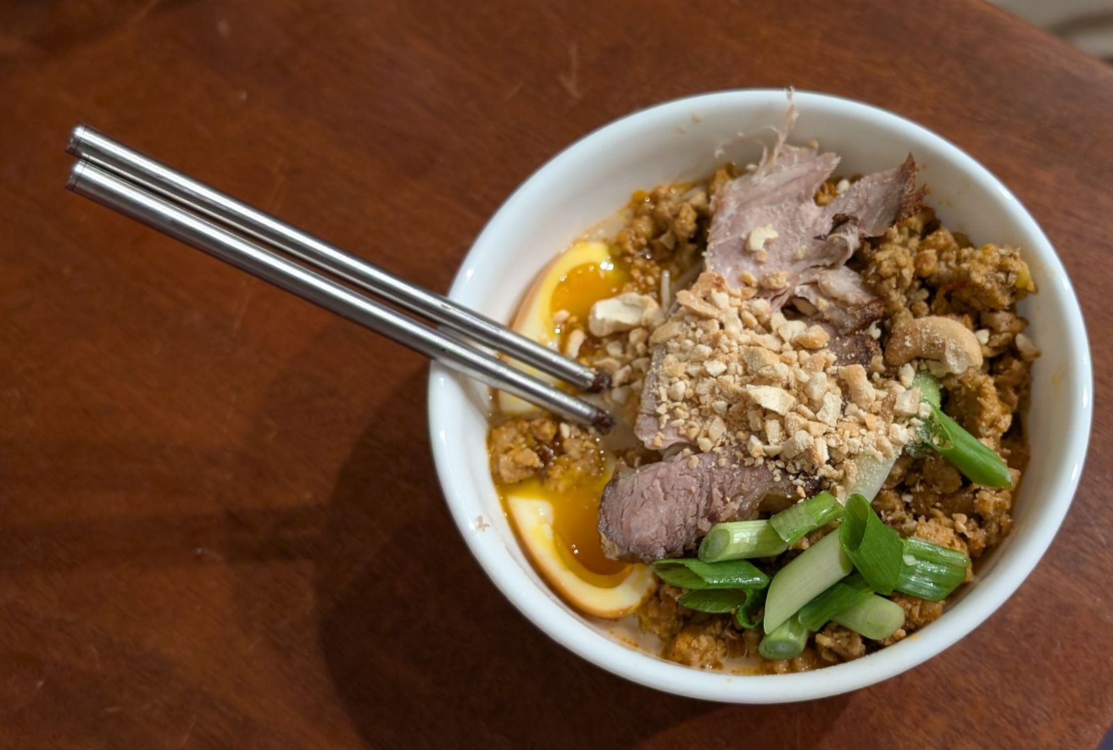 Toppings are pork shoulder “chashu” crisped up under the broiler before serving, seasoned ground pork, ajitsuke tamago, and roasted ground cashews.