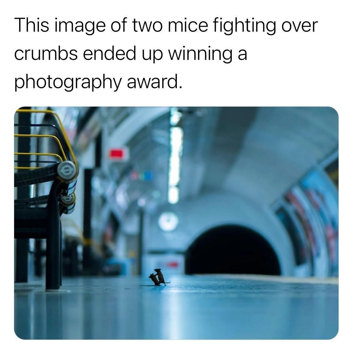 A photograph called “Station Squabble” by Sam Rowley captures two mice appearing to fight on a London Underground platform. The scene was photographed late at night and quickly drew attention for its timing and realism.
