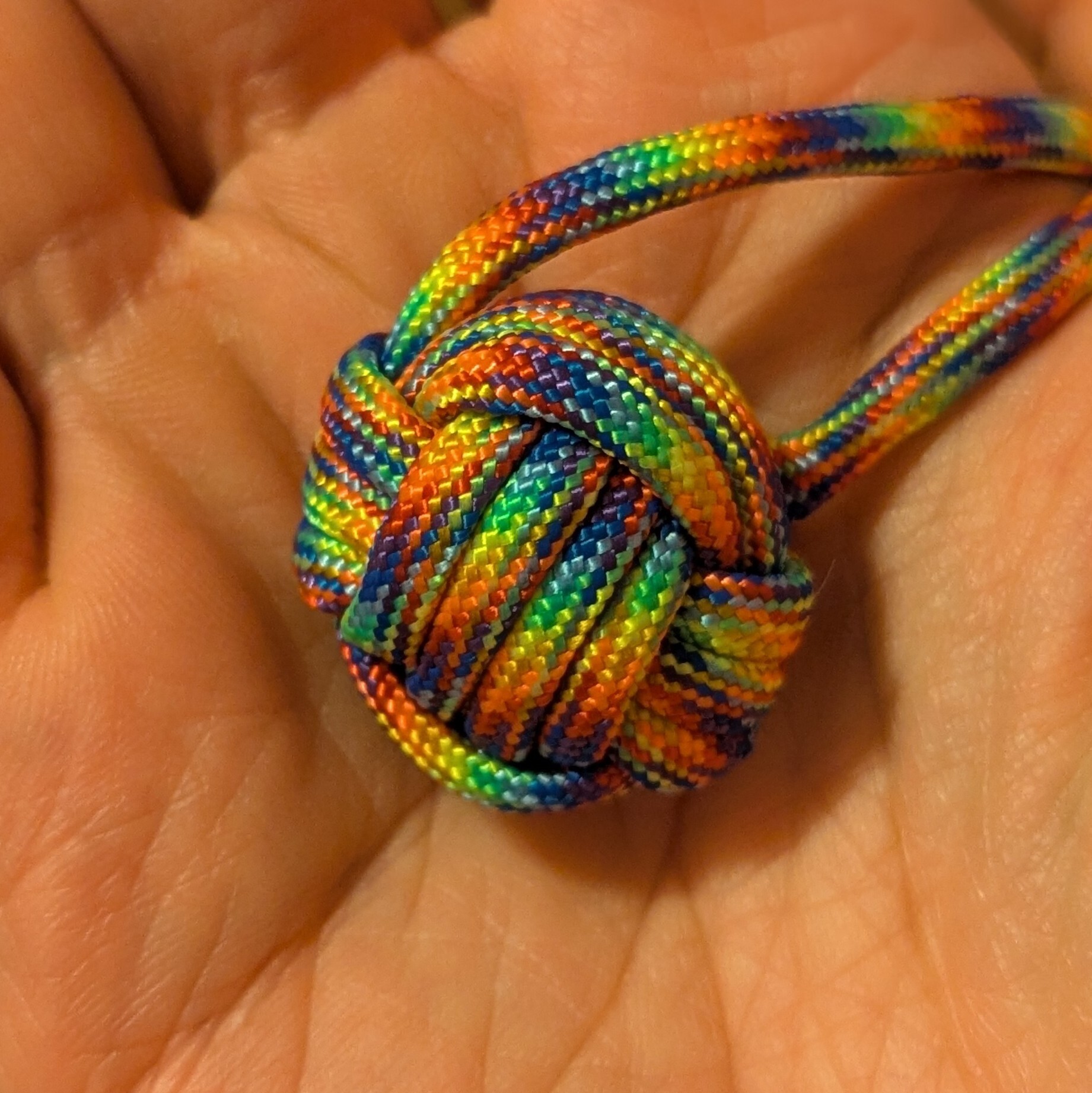 Here’s a monkey’s fist knot I just finished! I’ve been giving them to friends to use as keychains.