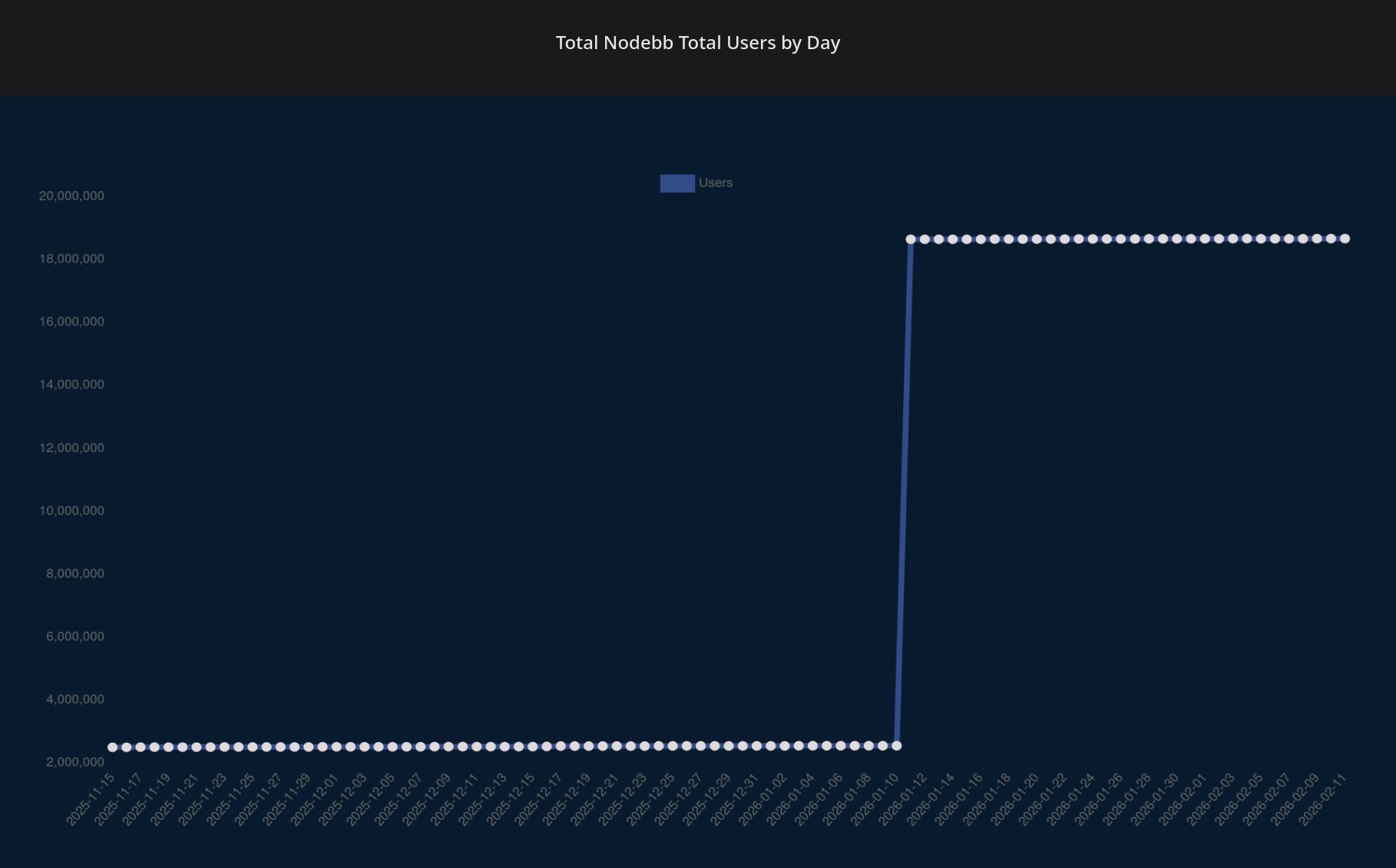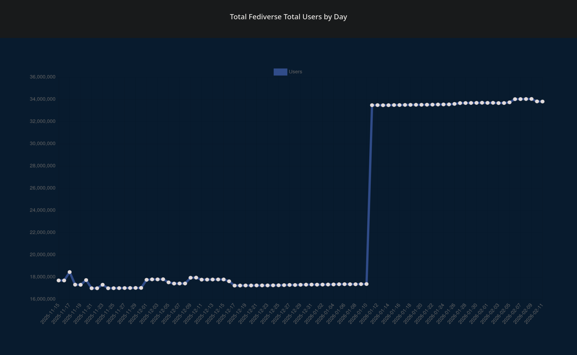 Just FYI everyone, this spike is sort of a glitch and its quite obvious just from looking at how steep the curve is. It all comes from nodebb which is a forum software and i guess they switched on federation on 11.01.2026 which gave us this magical bump.