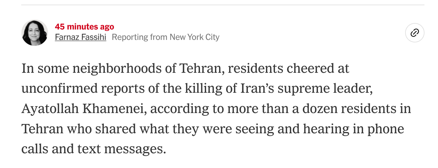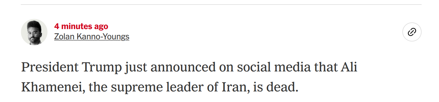 Supreme Ayatollah Khamenei was killed a few moments ago, a senior Israeli official told journalists off the record.