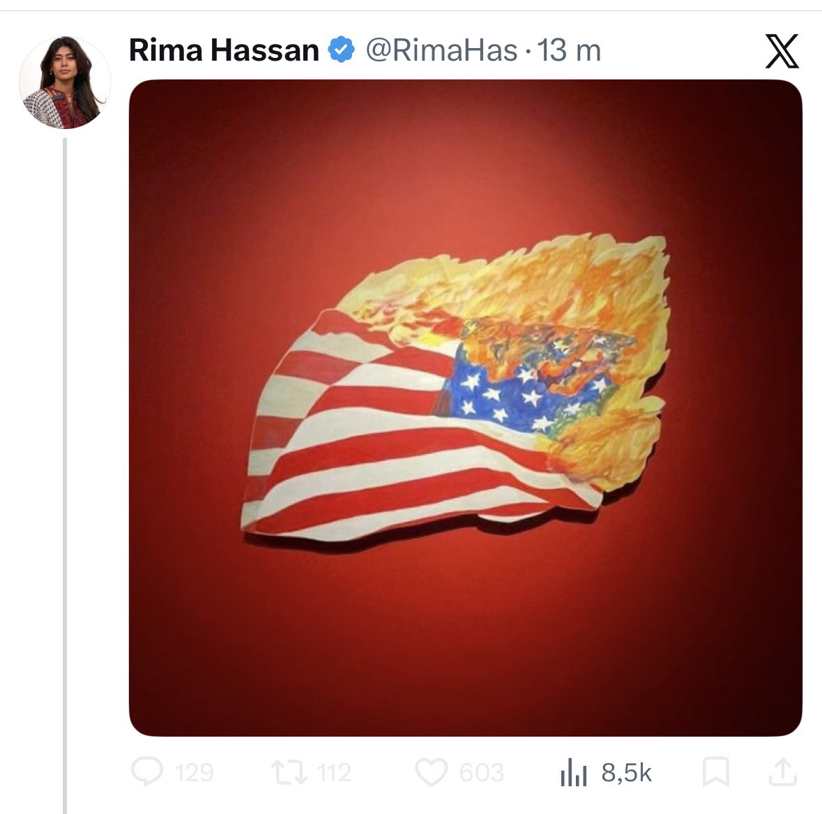 A french far-left politician who was questioned by police about her support for Hamas-Hezbollah just published a burning american flag. She really mad.
